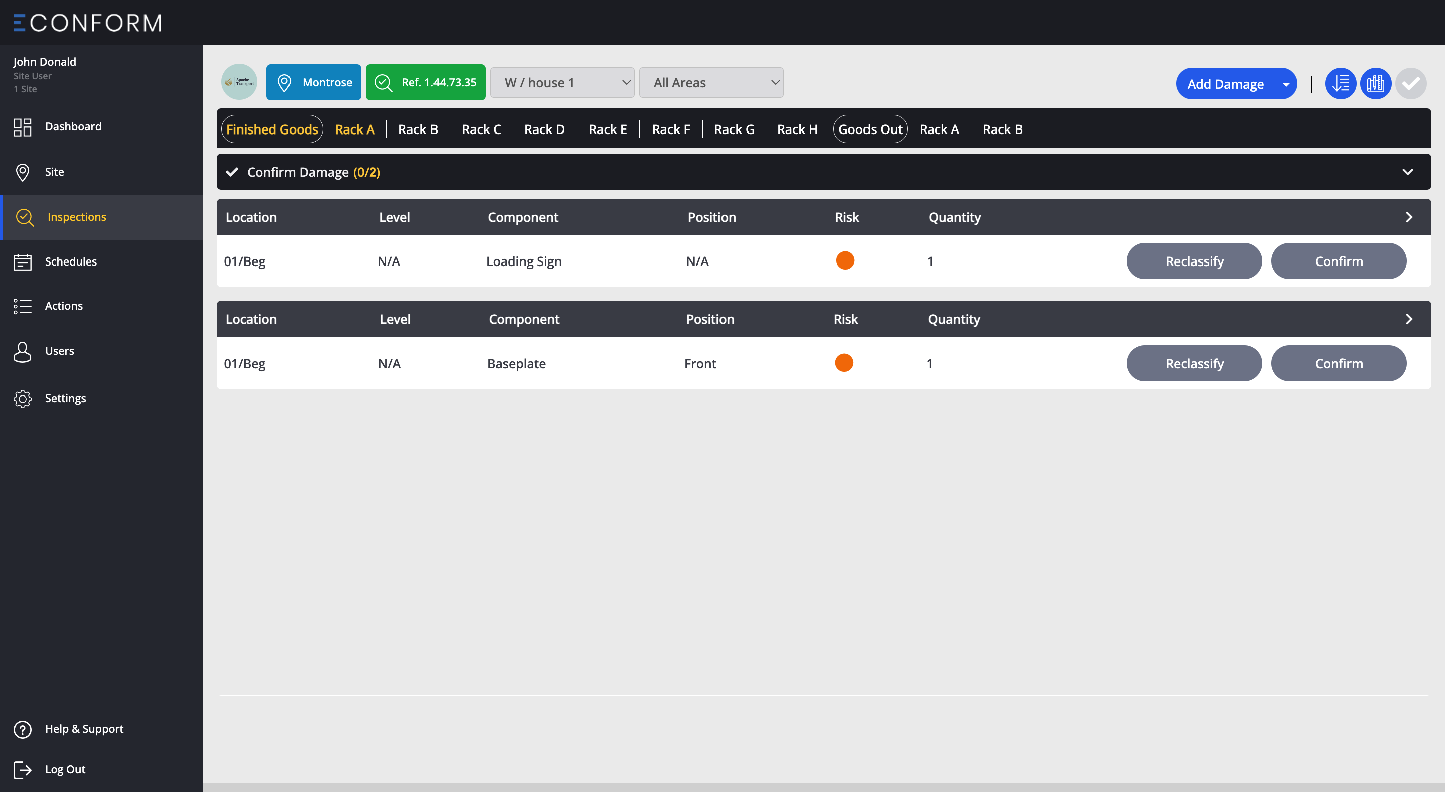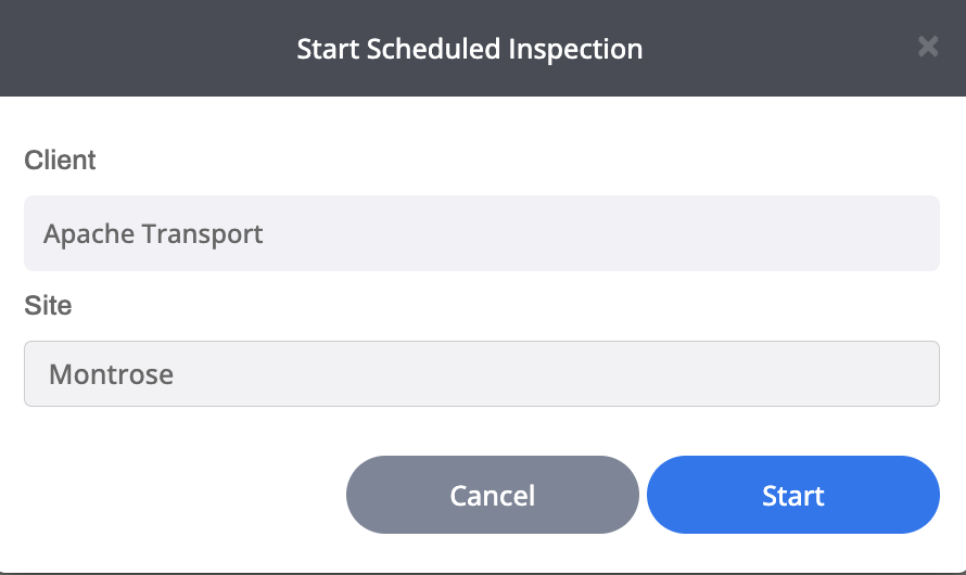 Tap on the Start Inspection button and a modal will pop up with details of your organisation and the site in which you will be conducting the inspection.