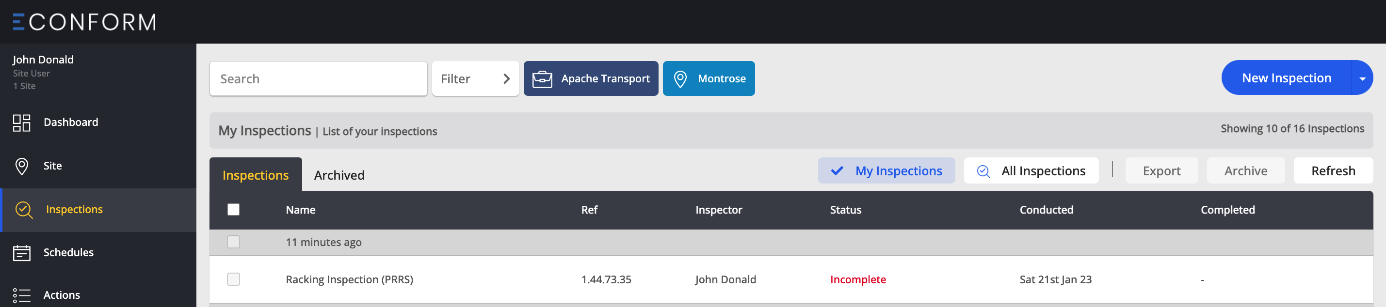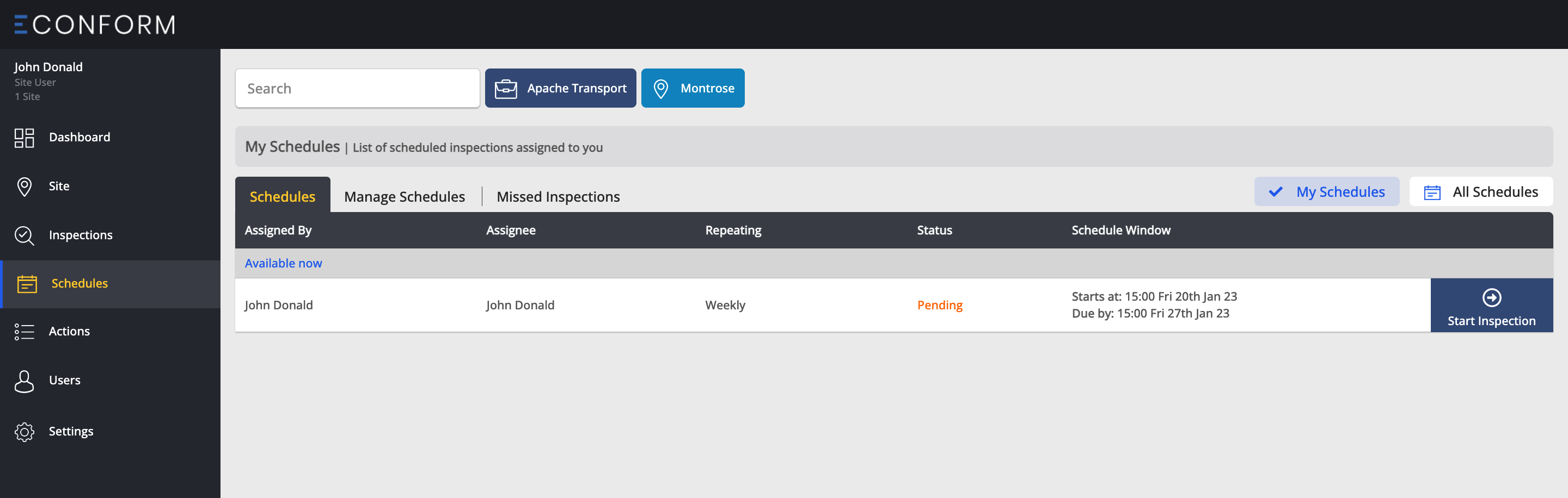 Tap on Schedules on the control panel on the left and you be taken to the Schedules page. Hover your curser over the row on the list and the Start Inspection button will appear.