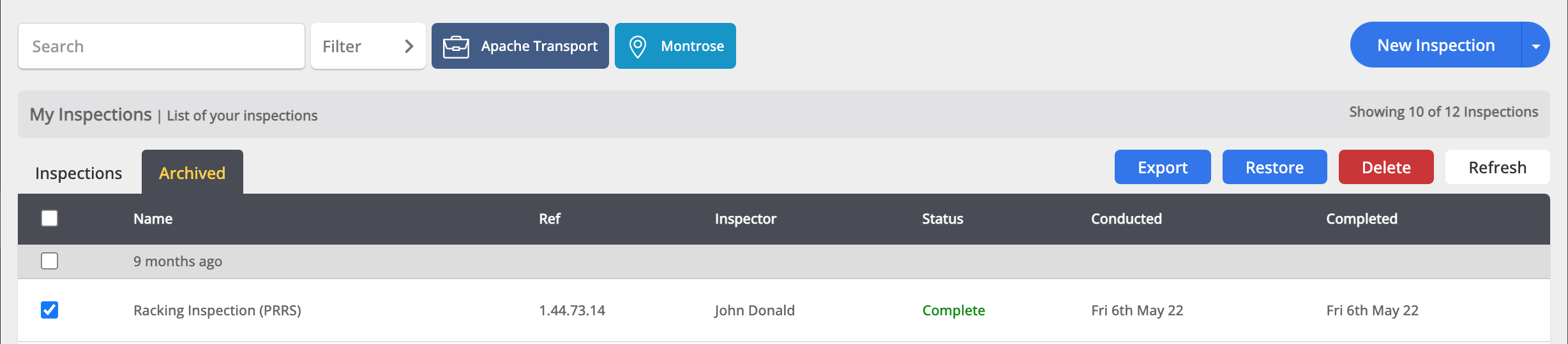 After archiving the inspection you would like to delete, navigate to the Archived tab on the Inspections page. You are able to Delete an archived inspection by hovering over the row and tapping on the red Delete button or by selecting the tickbox at the far left of the row, and tapping on the red Delete button at the top right of the list.